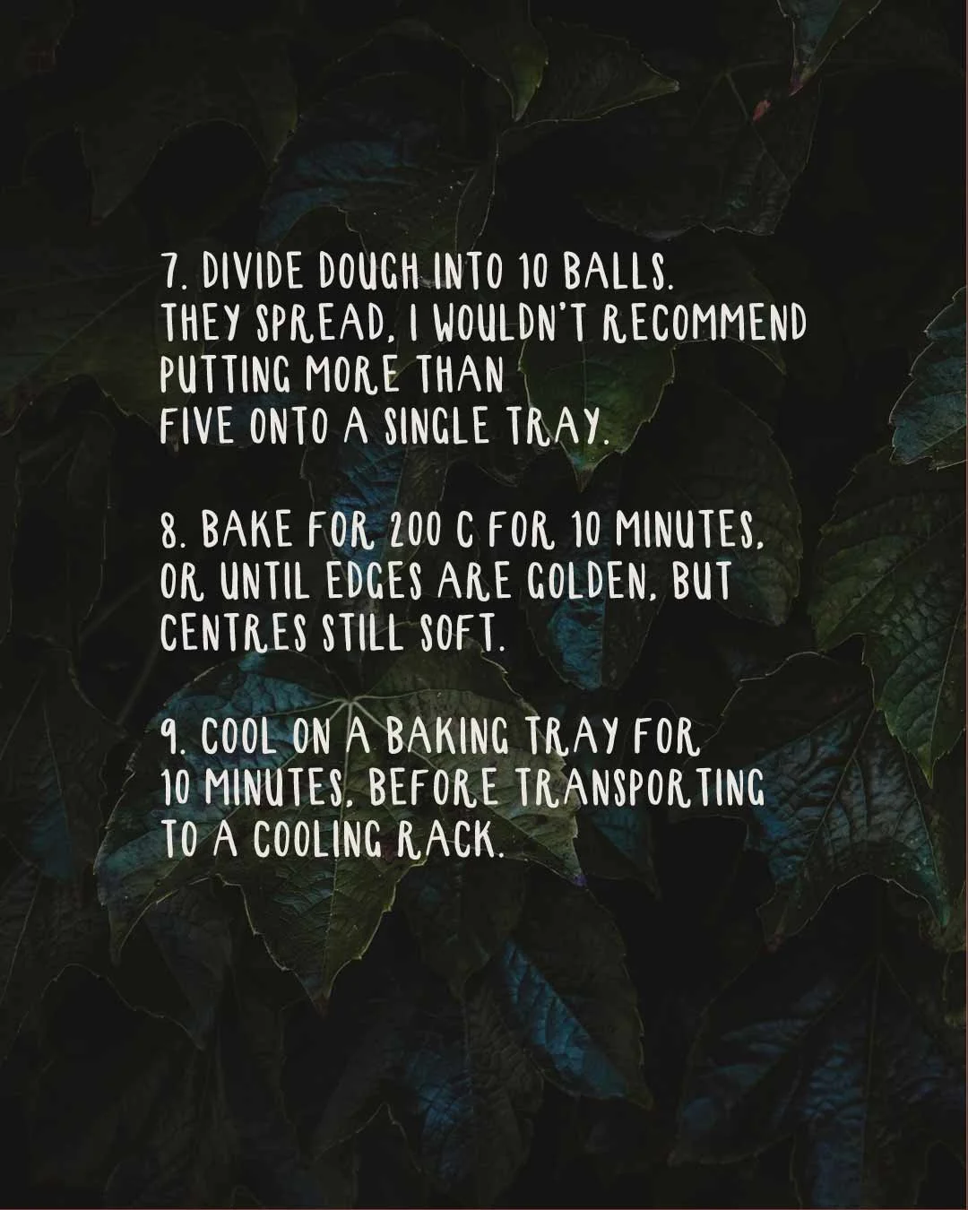 Makes 10-ish Cookies | Prep Time: 1 hr 30 mins | Cook Time: 10 mins | Oven Temp: 200 C