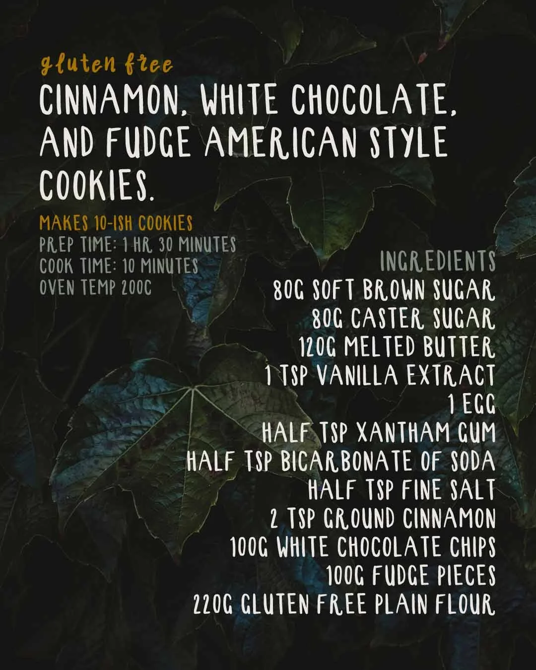 These moreish cookies are my absolute favourite, I’ve made several batches since learning the recipe, tweaking it to be gluten free. Not that these feel or taste gluten free, and managed to surprise my family! Although this recipe is for cinnamon, white chocolate and fudge, it’s a great base recipe if you want to substitute the spices and chips to something else.